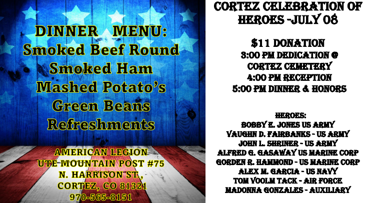 Join us on July 8th in beautiful Cortez, Colorado for our second Together: A Celebration of Heroes event honoring 8 distinguished Veterans from District 10 of the American Legion. The Ute Mountain Post #75 will be hosting the event at the Hall at 4:00 pm after we dedicate 8 trees at the Cortez Cemetery starting at 3 pm. We will be announcing the new Warrior 100 Immortal program which honors deceased American Heroes in each Colorado Legion District along with the current TCOH honors for the living Veterans.