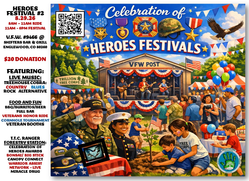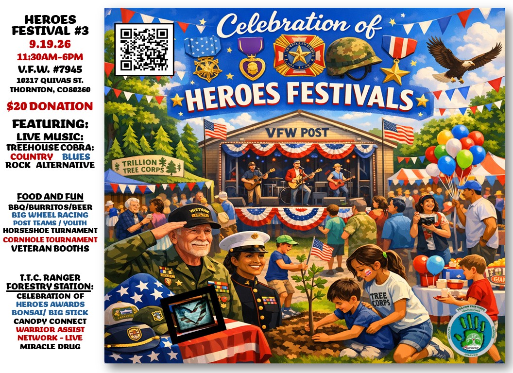 HEROES FESTIVALS 2026: Celebrating Colorado Veteran, First Responder, and Native American Heroes from over 30 V.F.W. and American Legion Posts across the Denver Metro area. Come join us on 4/25, 8/29, and 9/19 for Live Music, Food, and fun featuring Big Wheel Racing, Horseshoe and Cornhole tournaments, Forestry, Gardening, and BONSAI classes and workshops, and Veteran related booths. We will also be broadcasting live on our Warrior Assist Network featuring live interviews with the honorees. he events cost $20 with all proceeds going to the hosting Posts.